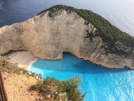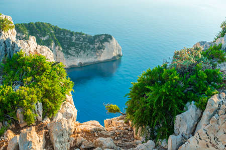 Visiting card of the island of Zakynthos. Bay Navagio. One of the most beautiful places in the World. View from a height of more than 500 meters. The Ionian Sea with the most beautiful