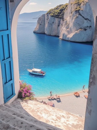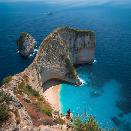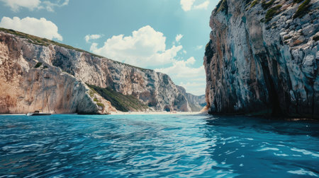 A boat floating in sparkling blue waters near towering rocks. AI-generated.