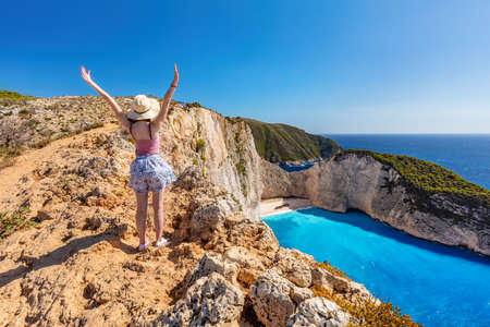 Woman tourist in Zakynthos, Greece admiring the Navagio shipwreck beach