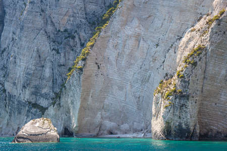 Limestone chalk colored like huge cliff rocks surrounding Navagio beach with Shipwreck and azure blue sea water. Zakynthos island, Greece
