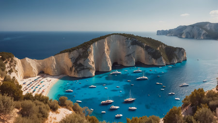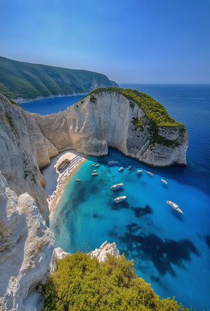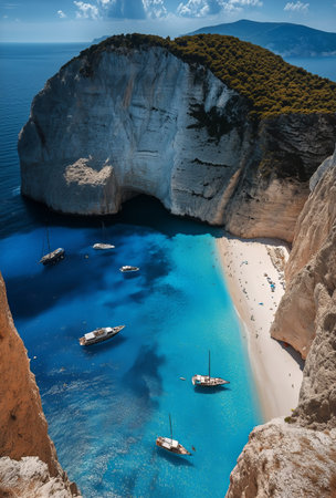 Breathtaking cove reveals clear turquoise water surrounded by steep cliffs. Sailboats anchor near a sandy beach under a sunny sky, offering a peaceful retreat.