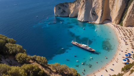 Aerial drone shot of Zakynthos Navagio beach with tourists with cruise ship in blue Ionnian sea
