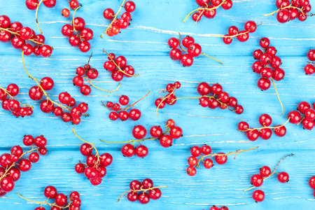 Background of scattered small branches of red currant on a blue wooden background