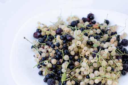 Fresh currents: black currents, white currents, blackberry and gooseberry. Mix of the berries on the white plate