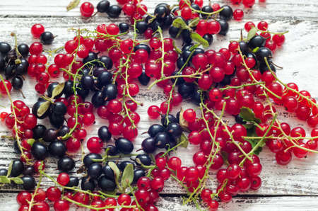Background of black and red currants. Fresh berries closeup. Top view. Background of fresh berries. Various fresh summer fruits. Red and black food.