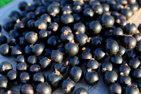 Black currents on wooden bench