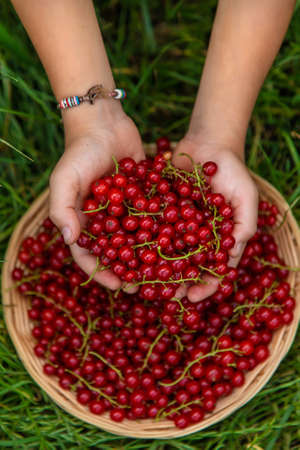 The child is harvesting red currants. Selective focus. Food.