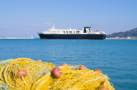 Zakynthos, Greece - April 2019 : Large passenger ferry boat approaching Zakynthos Port, Zante Island, Ionian islands