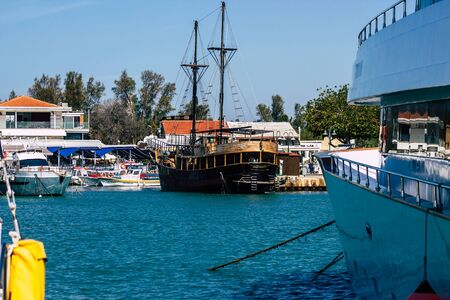 Paphos Cyprus March 01, 2020 View of boats moored in the harbour of Paphos in the afternoon
