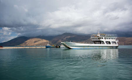 10 july 2016, two ferry on the pier, zkynthos landscape on the background, Greece