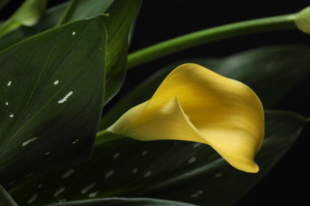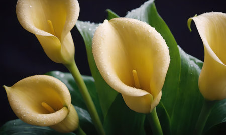 A stunning display of yellow calla lilies with striking centers surrounded by lush green leaves creates elegant floral arrangement perfect for any occasion. Generative AI. Dark background. Mother day.