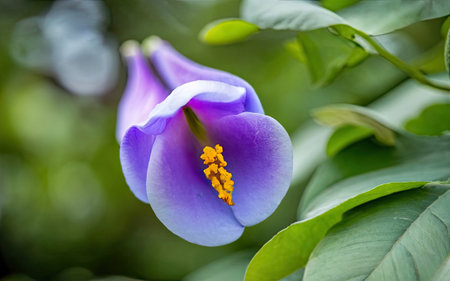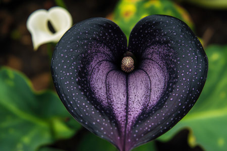 Close-up of a calla lily flower with heart-shaped petals, a white and purple flower, and dark green leaves in the background. Macro photography, as seen in National Geographic magazine or nature publications. --ar 3:2 --v 6.1 Job ID: 8eef6e09-ce7e-484a-a489-17389981e71e