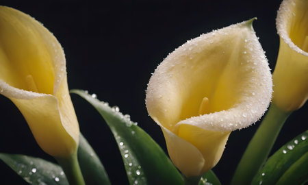 This stunning image showcases elegant white calla lilies adorned with dew drops, accompanied by lush green leaves, creating a serene and refreshing atmosphere.