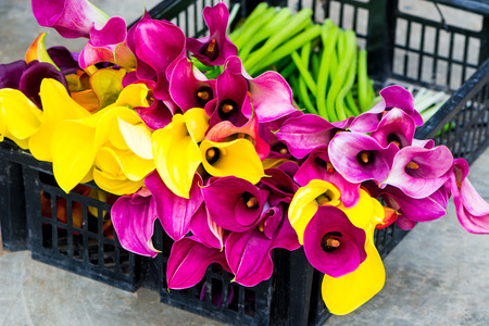 Colorful Calla lily flowers in full bloom on display at the farmers market