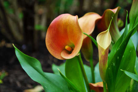 White blooming arum lilies with orange hearts on dark green background top view. Blossoming plants are growing in spring garden. Floral composition.