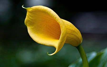 Vibrant yellow calla lilies bloom amidst dark green foliage in a stunning display of natural beauty. A captivating close-up showcases golden callas against a backdrop of lush, dark green foliage.