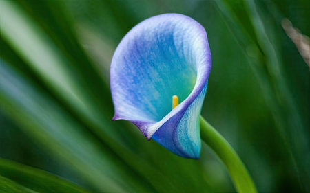 An elegant close-up of a calla lily with dew drops glistening on its smooth petals, highlighting its unique shape and the beauty of nature in early morning light.