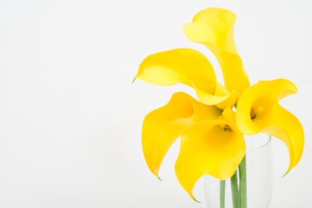 Pink calla lilies bouquet in glass vase on yellow backdrop