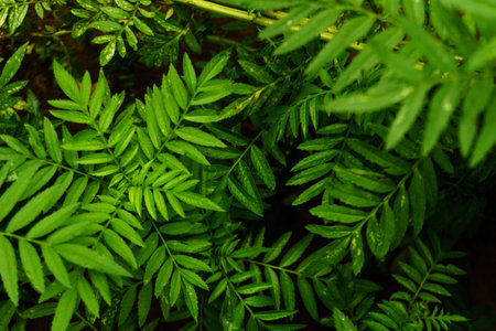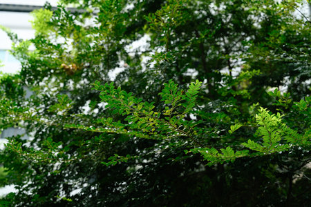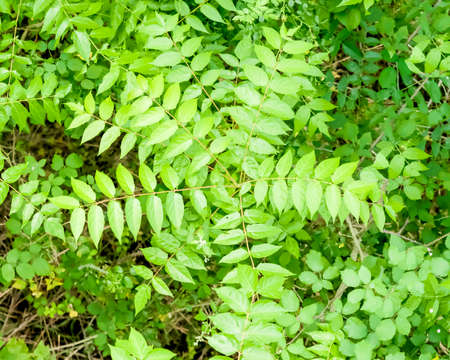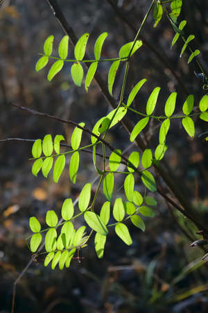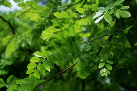 Lush green compound leaves on a black locust tree branch creating a vibrant natural pattern and symbolizing growth, freshness, and environmental beauty in outdoor light