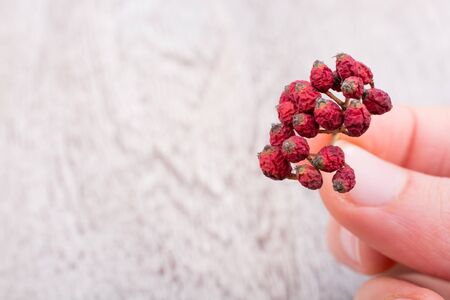 Horizontal photo of pink pepper branch held by a female hand, with blurred plants in the background. Ideal for natural and botanical design