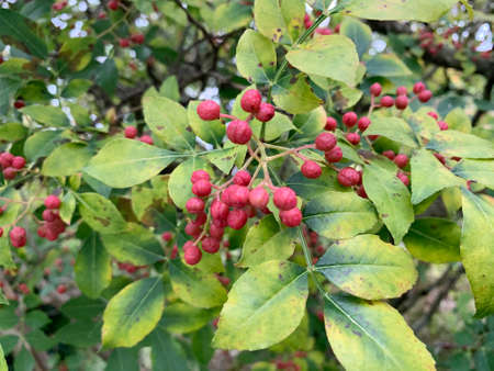 Japanese pepper fruits (cones). Rutaceae deciduous shrub. Dioecious, female plants produce cones that ripen to reddish-brown in the fall and produce shiny black seeds.