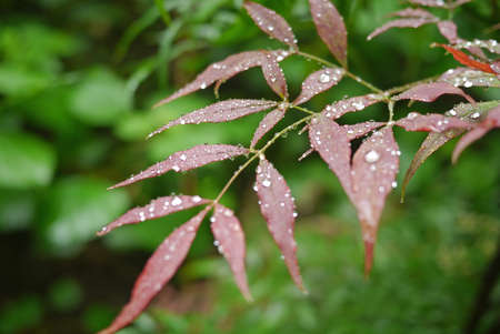 Close-up of vibrant green leaves adorned with water droplets, showcasing nature's beauty after rainfall in a serene outdoor environment.