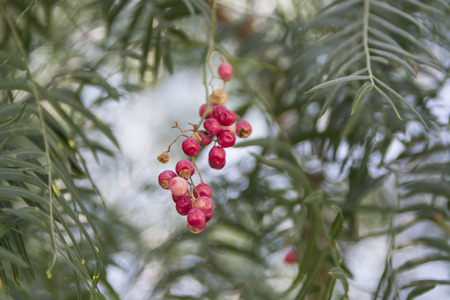 Fresh pink peppercorns on peruvian pepper tree branch. Blue sky at the background.