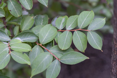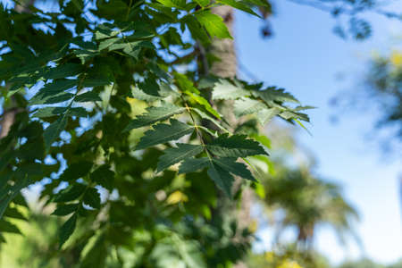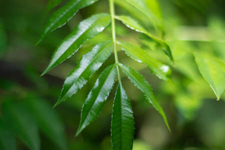 A branch of Azadirachta indica, neem tree showing compound frame leaves. Neem leaves ayurvedic medicinal herb. Neem Ayurveda medicinal background.