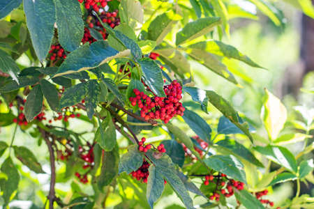 Elderberry Red (Sambucus racemosa) shrub with berries and green leaves in the garden in summer.