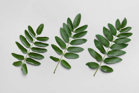 Fresh green branch presented on light background with copy space. Postcard layout. Flat lay