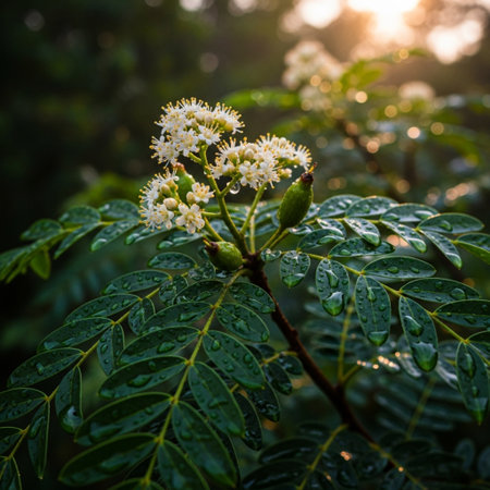 Close-up of vibrant green leaves adorned with water droplets, showcasing nature's beauty after rainfall in a serene outdoor environment.