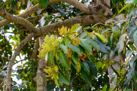 Seasonal blossom of evergreen avocado trees in April on plantations in Asturias, North of Spain.