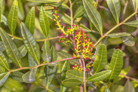 Mastic or Lentisk (Pistacia lentiscus) Tree blooming with red flowers. Extremadura, Spain. Nature Scene of Europe.