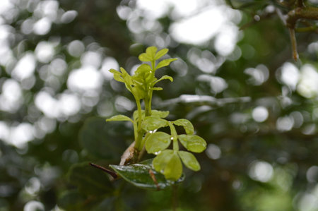 Fresh green leaves of robinia pseudoacacia, commonly known as black locust, dotted with rain droplets after a recent shower.