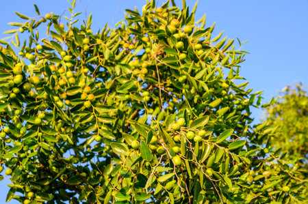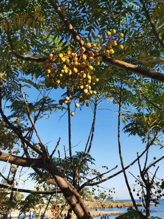 Protaras. Famagusta area. Cyprus. A tree with small yellow fruits against a blue cloudless sky.