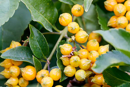 Orange dewdrop or Pigeon Berry, fruit buds. Fruit is a small round orange shape. Flowering shrub grows as an ornamental plant in the tropics. Duranta repens. Duranta erecta. Sea buckthorn