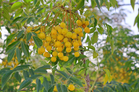 Branches of a chinaberry tree (Melia azedarach) with clusters of yellow autumn fruits (berries) and bright green leaves against a clear blue sky