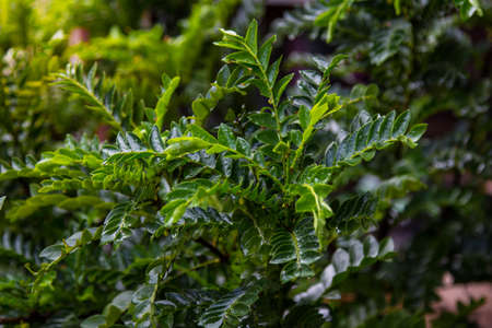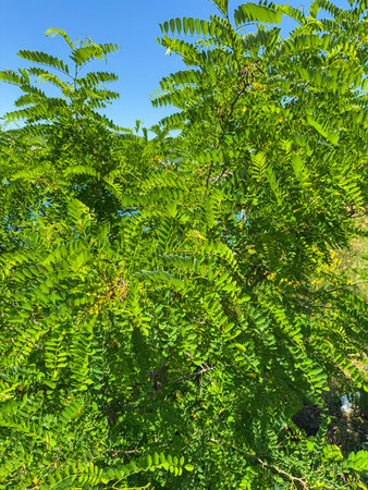 Lush green compound leaves on a black locust tree branch creating a vibrant natural pattern and symbolizing growth, freshness, and environmental beauty in outdoor light