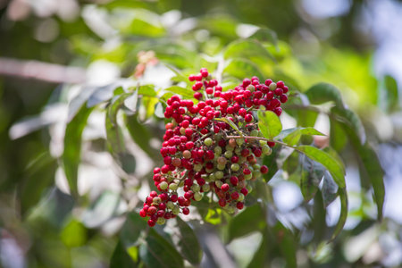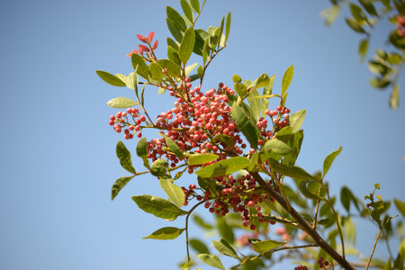 Fresh pink peppercorns on peruvian pepper tree branch. Blue sky at the background.