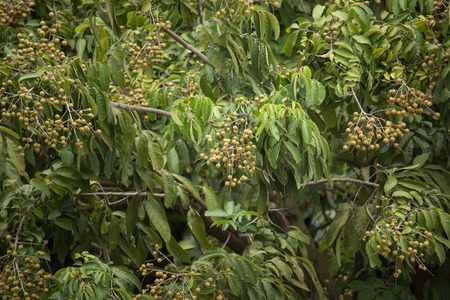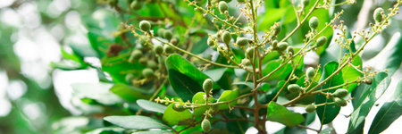 Panorama view young longan fruits and flowers blossom green foliage leaves at tropical orchard in Can Tho, Vietnam, Dimocarpus longan or dragon's eye is tropical tree in soapberry Sapindaceae. Asia