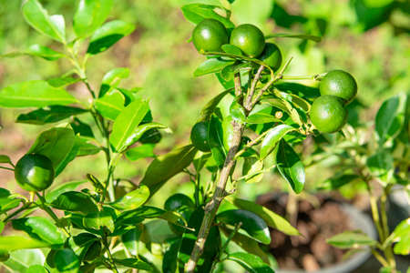 Fresh green organic limes hanging on tree ready for harvest. Lime is citrus fruit, taste sour excellent source of vitamin C. Seasonal fruit concept.