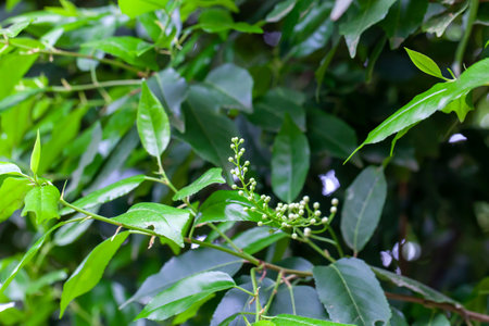 Close up of Neem flowers or Azadirachta indica flowers. A branch of inflorescence Neem flowers or Azadirachta indica flowers.