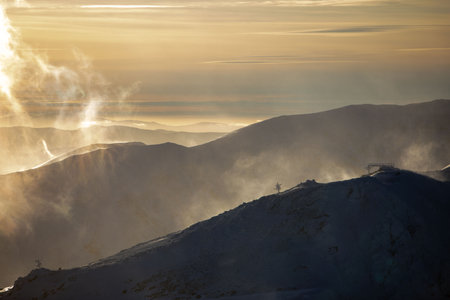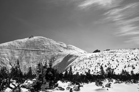 KARPACZ, POLAND - MARCH 08, 2020: Snezka or Sniezka (in Czech and Polish) is a mountain on the border between the Czech Republic and Poland, Giant Mountains, Poland, Europe.