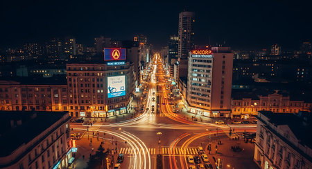 Aerial view of a busy urban intersection illuminated at night, featuring light trails from vehicles, tall buildings, and vibrant city lights.