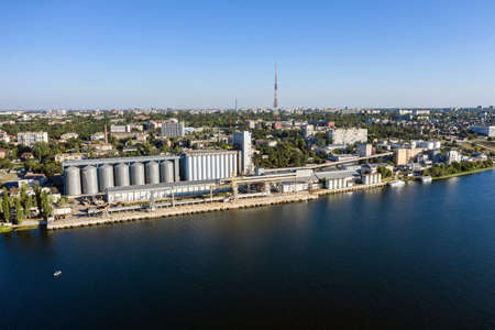 Landscape view of the industrial port near the sea. Cranes, machines, work equipment.