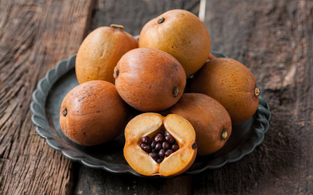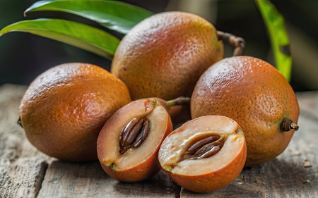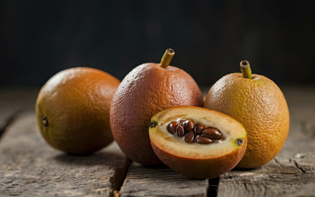fresh sapodilla fruits on old wooden background. tropical fruits concept