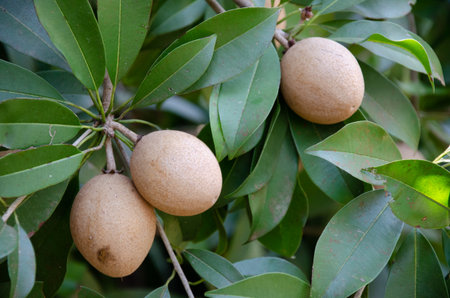 Manilkara zapota fruit growing on the tree close up view