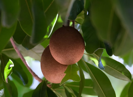 Ripe Sapodilla Fruit Hanging on a Branch with Green Leaves
