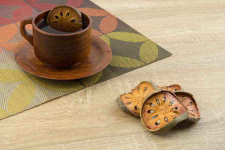 Hot dried bael tea in a wooden cup with dried bael slices