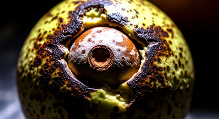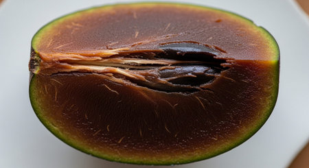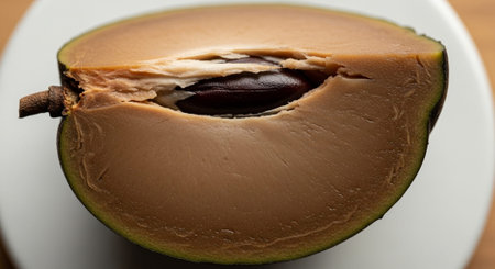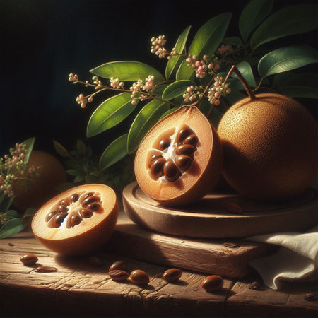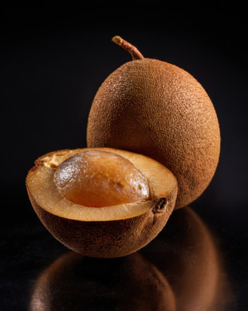 A ripe sapote fruit is displayed, partially cut, revealing its creamy flesh and seed. The dark setting enhances the fruits natural colors and textures.